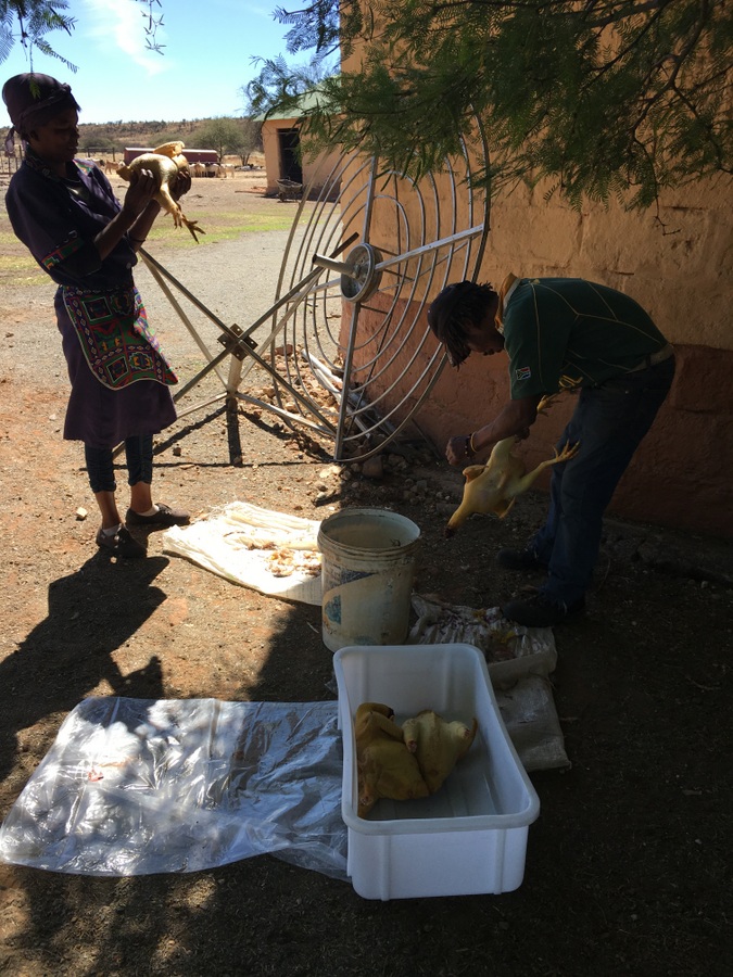 Intussen leer ek ook om hoenders te slag en skoon te maak….die ou manier natuurlik! Sophia en Toti is my leermeesters. Dis flippen harde werk! Water in die drom kook, dan die hoender daarin sak om die vere sag te maak, dan vere uittrek…wat ‘n ewigheid vat, en dan die klein veertjies afbrand met ‘n kers of koerant papier.